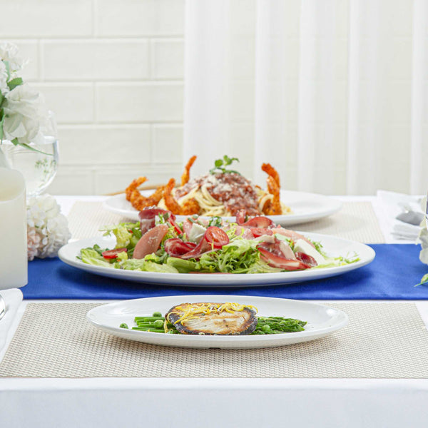 Add a contemporary look to your dishes with our Voga Oval White Melamine Small Plates. Constructed from high-quality melamine, these dinner plates are durable and won't break easily, ideal for withstanding your rigorous catering use. These white plates have an elegant round design that stylishly serve a side of vegetable fried rice at your restaurant, or to elegantly present a side of potato salad at your bistro. With a glossy white finish, these serving plates bring simple elegance to your food presentation. For a simple cleanup, these pasta plates can be conveniently used in the top rack of a dishwasher. These oval plates measure 10 inches in length by 7 inches in width. Shipped in a 10 count box.