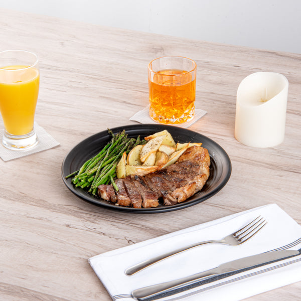 Set the scene with our Voga Round Black Melamine Medium Plates. Constructed from high-quality melamine, these serving plates are conveniently durable and won't break easily, perfect for serving various hot and cold food items. These dinner plates mimic the look of a black stone and create a beautiful backdrop to elegantly serve savory butternut squash ravioli at your restaurant, or to stylishly present herb-roasted chicken at your next catered luncheon. With a contemporary round design, these salad plates instantly upgrade the look of your restaurant, cafe, catered event, and more. These round plates can be used in the top rack of a dishwasher to streamline your cleaning process. Each black plate measures 10 inches in diameter by 1.25 inches in height. Shipped in a 10 count box.