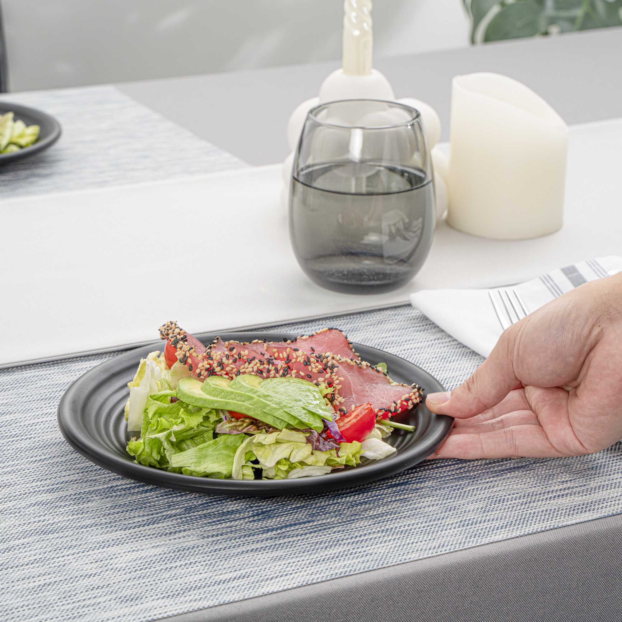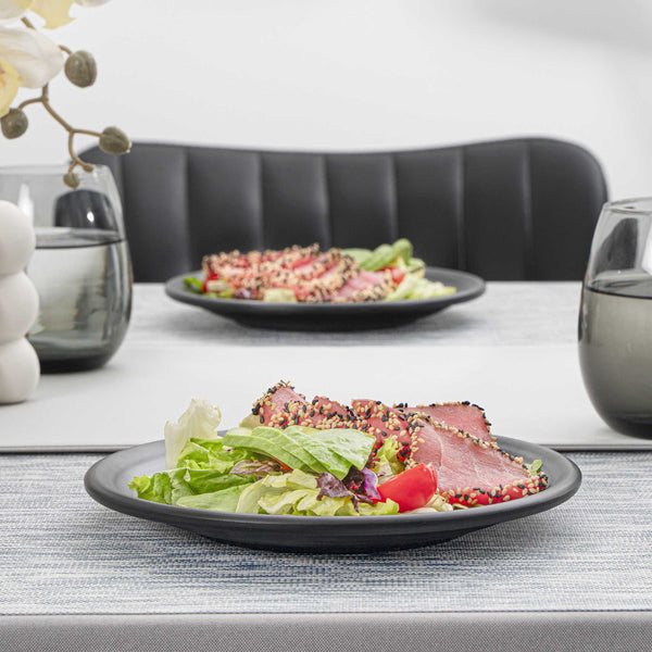 Bring sophistication to entrees with our Voga Round Black Melamine Small Plates. These dinner plates are crafted from robust melamine for premium durability and are ideal for serving hot or cold food items. Featuring a minimalist round shape, these serving plates instantly upgrade food presentations at your restaurant, bistro, and catered event. These round plates mimics the look of a black stone and are a stylish option to elegantly serve shrimp fried rice at your restaurant or to stylishly serve chicken burrito bowls at your cafe. To simplify your post-meal cleanup routine, these black plates can be conveniently used in the top rack of a dishwasher. These salad plates measure 8 inches in diameter by 1 inch in height. Shipped in a 10 count box.