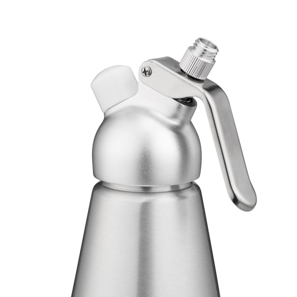 Add the finishing touch to treats using our Whip Tek 0.5 Liter Aluminum Whipped Cream Dispenser. Featuring an easy-to-pull lever, this whipped cream dispenser provides a comfortable grip when topping off sweets with fresh whipped cream. This cream dispenser includes 3 interchangeable decorator tips to create stunning dessert presentations. To ensure the piping tips remain spotless after use, this aluminum cream whipper also includes a cleaning brush. For a perfect puff of mousse every time, pair this whipped cream dispenser with our coordinating cartridges (SKU: RWT0632S) to provide the ideal amount of charge during use. Each cream dispenser brings a plastic cover and cartridge holder with a crosshatch design that allows the holder to be easily unscrewed. To prevent damages, simply place the cover onto the holder after use. Crafted from durable aluminum, this whipped cream dispenser is meant for long-lasting use at your bakery, restaurant, or food truck. Measuring 3.5 inches in diameter by 12.25 inches in height, this aluminum cream whipper holds up to 0.5 liters of your desired toppings. Sold in a 1 count box. Cartridges available and sold separately.