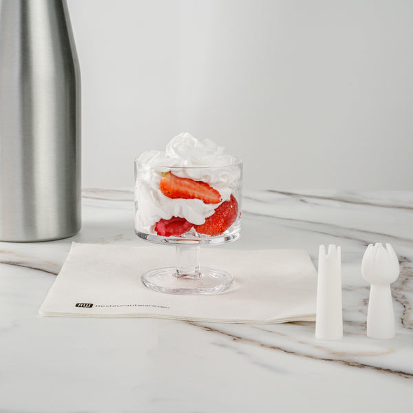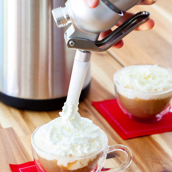 Elegantly add whipped cream to decadent desserts using our Whip Tek 1 Liter Aluminum Whipped Cream Dispenser. Featuring 3 interchangeable plastic decorator tips, this aluminum cream dispenser is perfect for adding unique designs to complete the look of your treats. To keep piping tips clean after use, this whip dispenser includes a small cleaning brush. Ideal for effortless dispensing, this cream whipper has an easy-to-pull lever that provides a comfortable grip. Coordinate this aluminum cream dispenser with our matching cartridges (SKU: RWT0932S) for the perfect amount of charge when dispensing sweet or savory toppings. This whip dispenser includes a plastic cover and cartridge holder with a crosshatch design that allows the holder to unscrew easily during use. To keep this cream whipper withoutdamages, simply place the cover onto the holder after charging. This whip dispenser is made from high-quality aluminum and is meant to withstand long-lasting use. Measuring 4.25 inches in diameter and 14.25 inches in height, this aluminum cream dispenser holds up to 1 liter of whipped cream or mousse. Sold in a 1 count box. Cartridges available and sold separately.