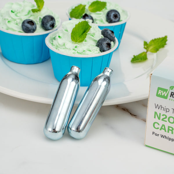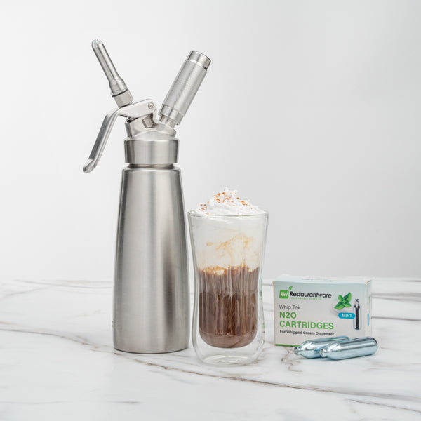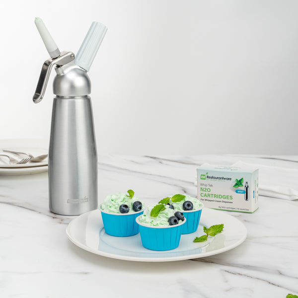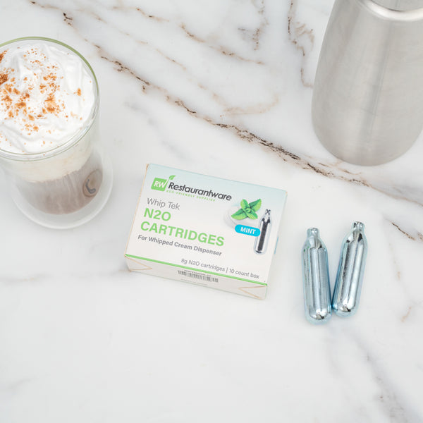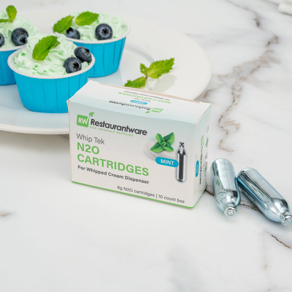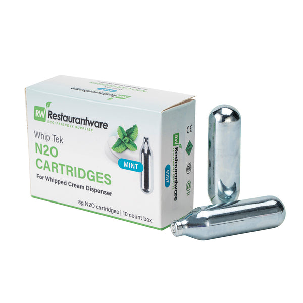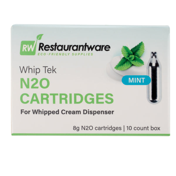 Add pizzazz to any recipe using our Whip Tek Mint 8 Gram N2O Cartridges. These nitrous oxide chargers are designed to produce up to 1 pint of mint-flavored whipped cream or foam. The mint flavor of these whipped cream dispensers makes it easy for you to add a sweet taste and touch of freshness to your beverages or desserts. These whipped cream cartridges do not leak to keep them from losing their charge before use. Coordinate these leakproof cream cartridges with our selection of whipped cream dispensers for a simple way to create one-of-a-kind dishes. These carbon steel whipped cream cartridges are conveniently recyclable for fast and hassle-free cleanup after making whipped cream. Containing up to 8 grams of pure N2O, these whipping cream cartridges are not refillable and weigh 32 grams. Available in a 10 count box. Whipped cream dispensers are available and sold separately.