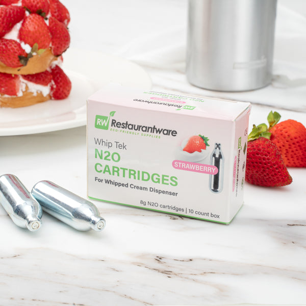 Add a hint of strawberry to your one-of-a-kind desserts using our Whip Tek Strawberry 8 Gram N2O Cartridges. Each cream dispenser produces up to 1 pint of whipped cream or foam. Filled with a strawberry flavor, these whipped cream chargers add a refreshing and sweet flavor to coffees or desserts offered at your foodservice establishment. These N2O cartridges are leakproof to ensure they are full of charge and ready to use. Pair these strawberry whipped cream charges with our collection of whipped cream dispensers to effortlessly add the finishing touches to dishes. Constructed from carbon steel, these N2O cartridges for cream dispensers are conveniently recyclable for an eco-friendly way to dispose of them after making whipped cream. Containing up to 8 grams of pure N2O, these pressurized cartridges are not refillable and weigh 32 grams. Shipped in a 10 count box. Whipped cream dispensers are available and sold separately.
