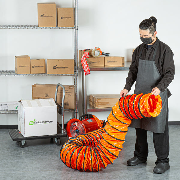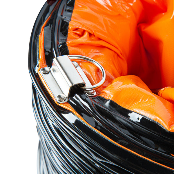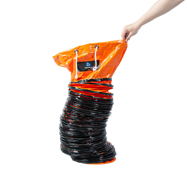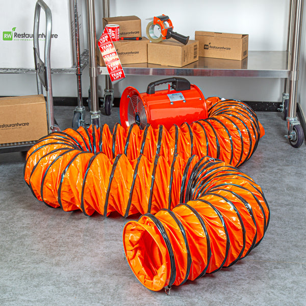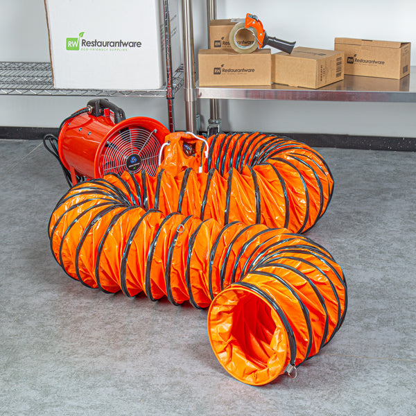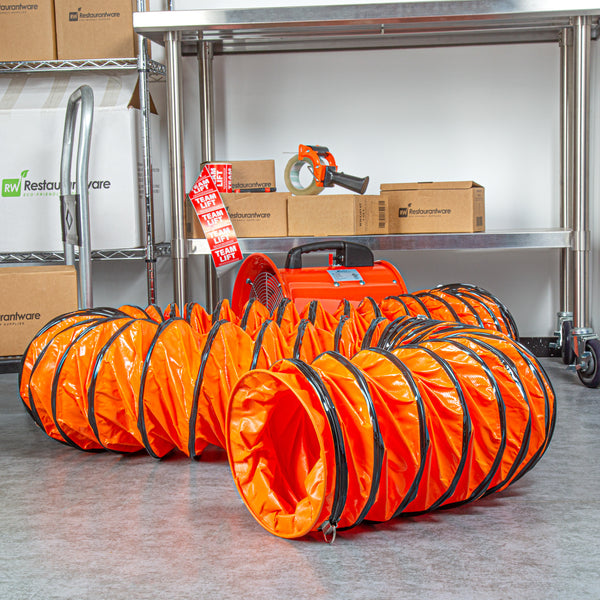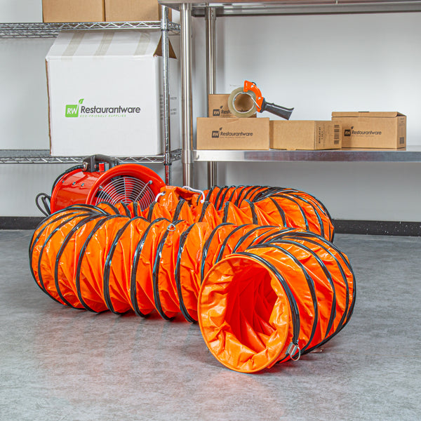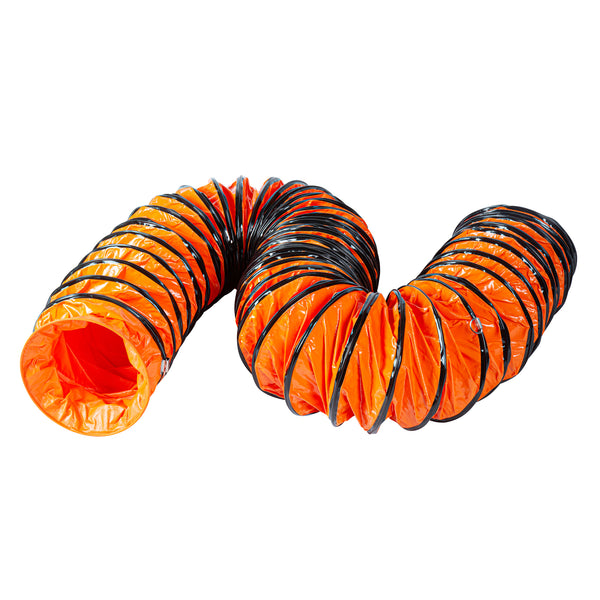 Optimize your ventilation setup with our Wind Blade Orange PVC Ventilation Duct Hose. Designed to work seamlessly with our high-velocity 10-inch ventilator fan (SKU: RWT1894R), this duct hose efficiently channels fumes and particles away from work areas to maintain cleaner conditions. The reinforced design of this ventilation hose features rings that keep it from collapsing under pressure, ensuring smooth airflow and avoiding blockages. Crafted from heavy-duty PVC, this ducting pipe won’t tear and is flexible, allowing it to navigate confined spaces and withstand being dragged across surfaces without damage. This flexible duct hose includes an adjustable rope to secure it tightly around the fan, avoiding air leaks and ensuring a reliable connection. Equipped with D-rings, this air ventilator hose can be easily attached to ceilings or walls, keeping it elevated and out of the way in various settings. Insulated to maintain the temperature of the ventilated air, this flexible vent pipe is ideal for maintaining consistent conditions. With waterproof and oil-proof properties, this PVC flexible duct hose stands up to harsh settings including heavy rain, high humidity, and oil spills. Measuring 25 feet long by 9.84 inches wide, this duct hose can be retracted to a compact size for easy portability and quick setup wherever needed. Sold in a 1 count box.