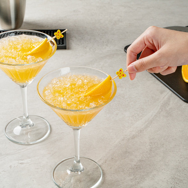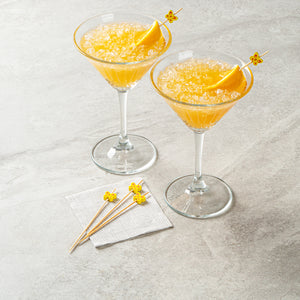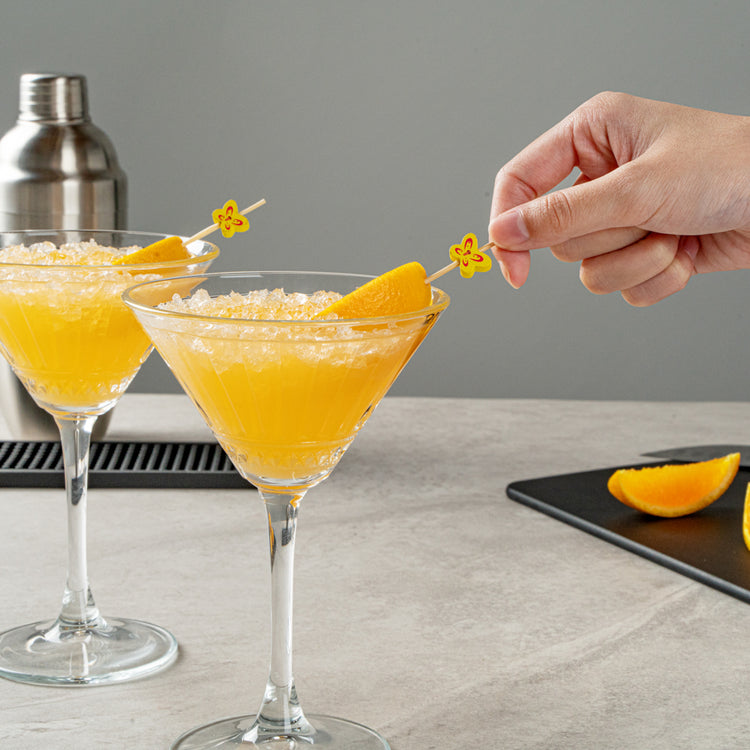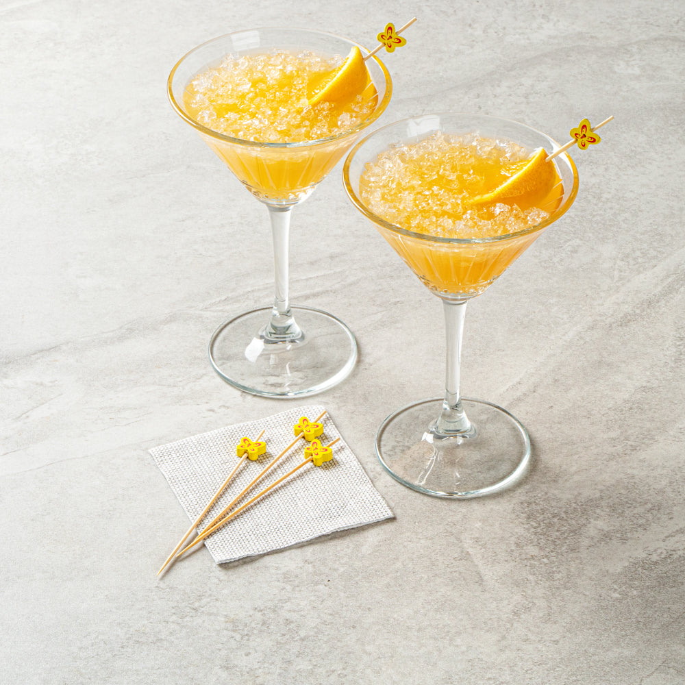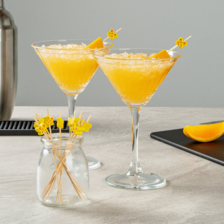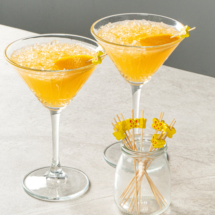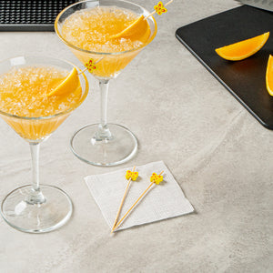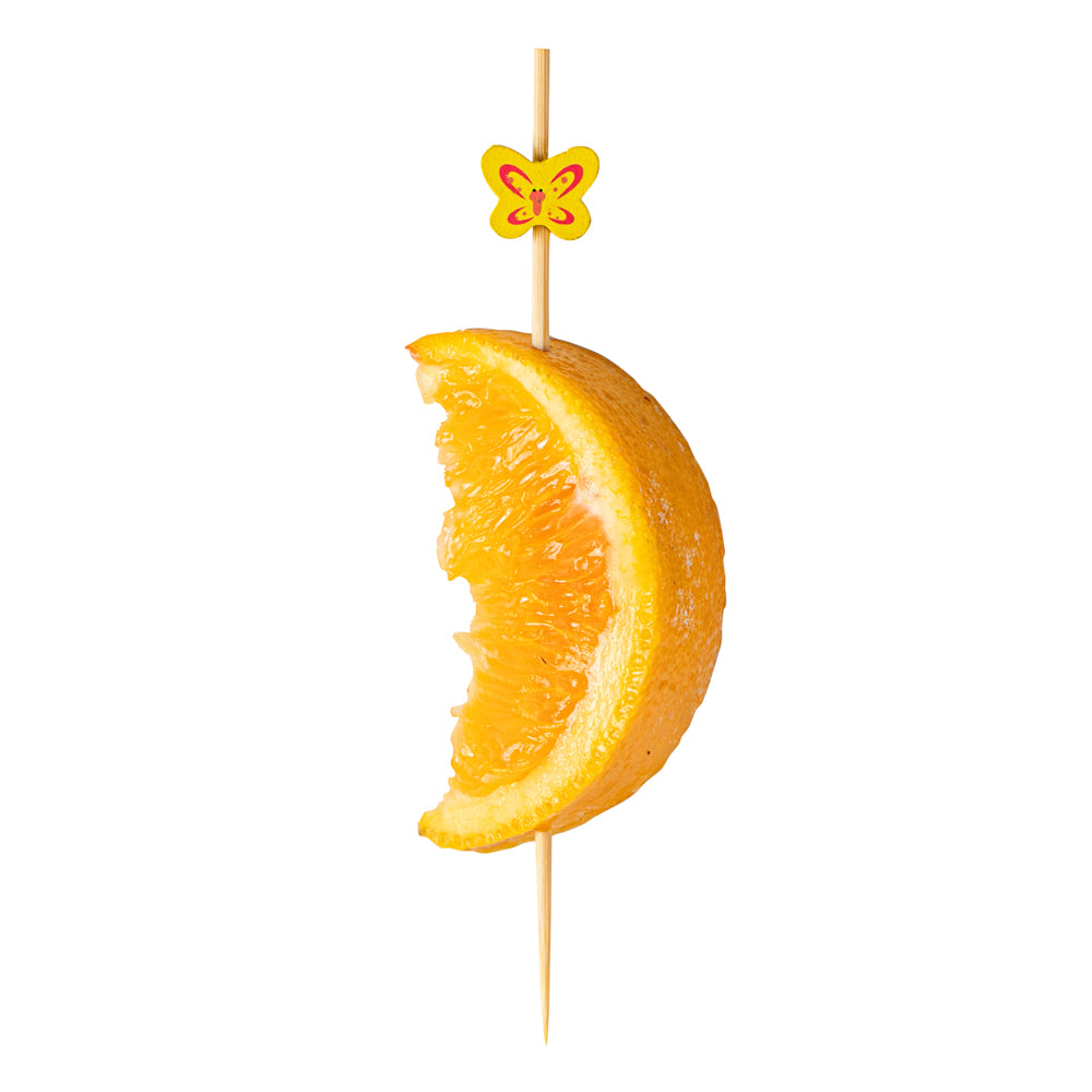 Enhance your cocktail presentation with flair and functionality. Yellow Pixy Bamboo Cocktail Sticks effortlessly elevate your foodservice offerings with their butterfly design, adding a decorative touch to appetizers and cocktails. Crafted from biodegradable bamboo, these cocktail sticks measure 4.7 inches in length and boast a sharp end that easily pierces various ingredients, ensuring quick assembly and efficient preparation for busy bartenders and chefs. The splinter-free surface guarantees safe handling, making these party picks a reliable choice for bustling events and upscale gatherings. Their vibrant yellow hue makes them an eye-catching addition to any display, while their hot and cold food-friendly nature ensures versatility across menu items. Offer your guests a memorable dining experience with these cocktail garnish picks that seamlessly blend style and practicality. Each order includes 1000 Yellow Pixy Bamboo Cocktail Sticks.