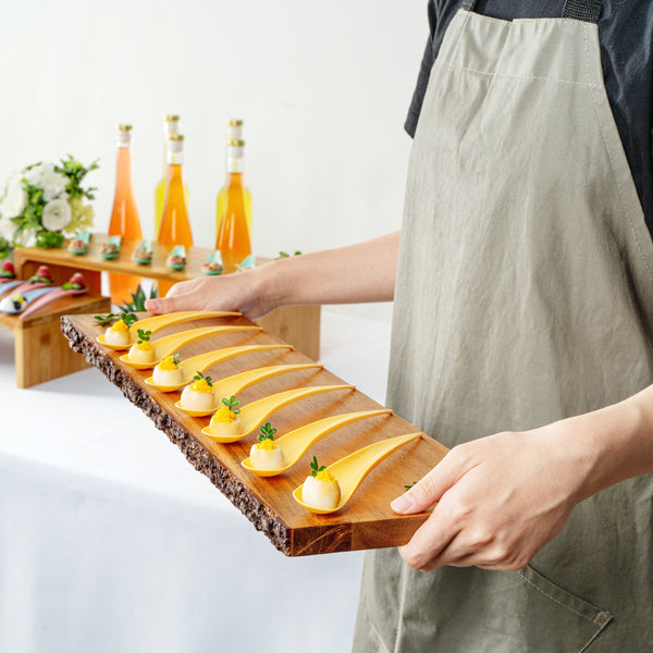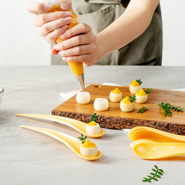 With a round, flat surface and slightly curved handle, these plastic serving spoons conveniently stand upright. Keep your samples intact!
